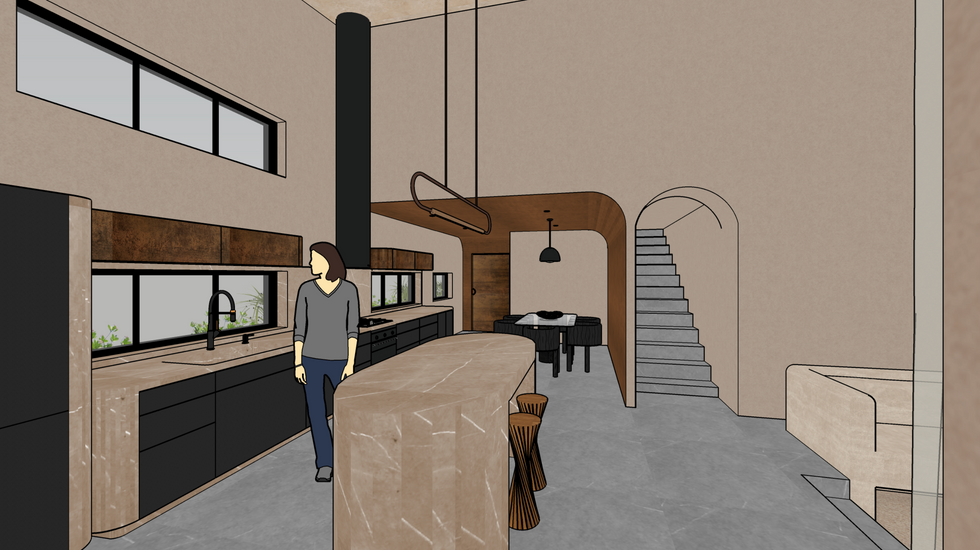 A paleta de cores terrosas, que lembra as dunas do deserto, cria um cenário harmonioso, enquanto paredes curvas e um banco de ilha acrescentam elegância escultural ao design geral.