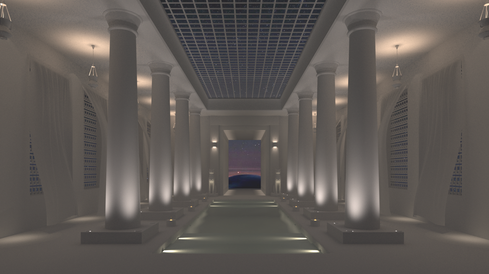 A entrada apresenta esculturas majestosas de gatos dourados, evocativas do reverenciado simbolismo felino da época. Conforme a luz do dia banha o espaço, a piscina brilha com um brilho encantador, criando uma narrativa visual cativante.